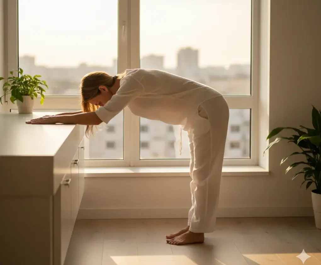 - So geht’s: Stell dich etwa einen halben Meter vor ein Fensterbrett oder einen stabilen Tisch. Lege die Unterarme darauf ab und tritt einen kleinen Schritt zurück. Lass nun dein Brustbein sanft Richtung Boden sinken, während dein Rücken lang bleibt.